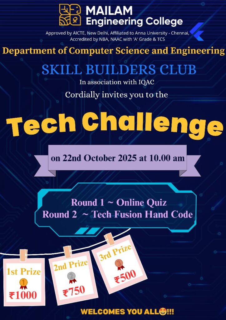 The Department of Computer Science and Engineering at Mailam Engineering College, through the Skill Builders Club in association with IQAC, is hosting the Tech Challenge competition for all first-year students. The event will take place on 22nd October 2025 at 10:00 AM.