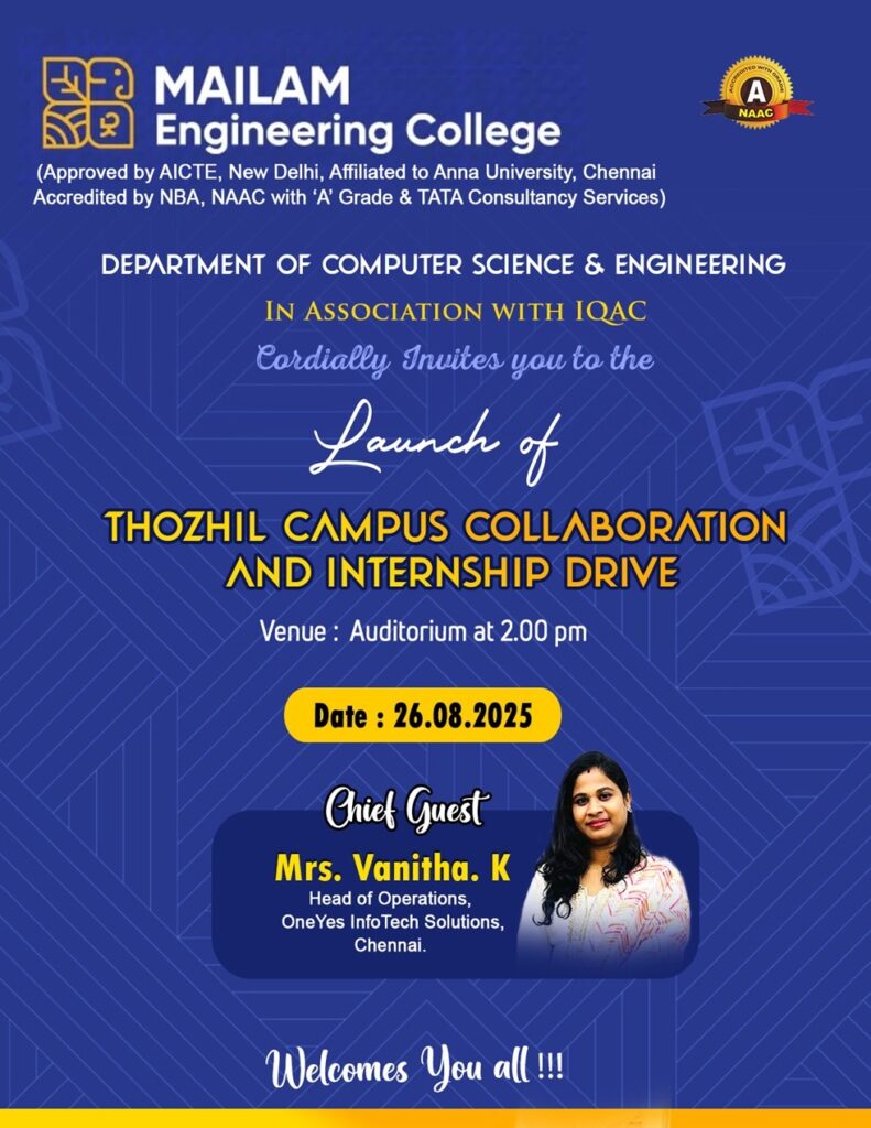 The Department of Computer Science and Engineering is organizing “Thozhil Campus Collaboration and Internship Drive” on August 26, 2025, for all MEC students. The session will be led by Mrs. K. Vanitha, Head of Operations, OneYes Infotech Solutions, Chennai.