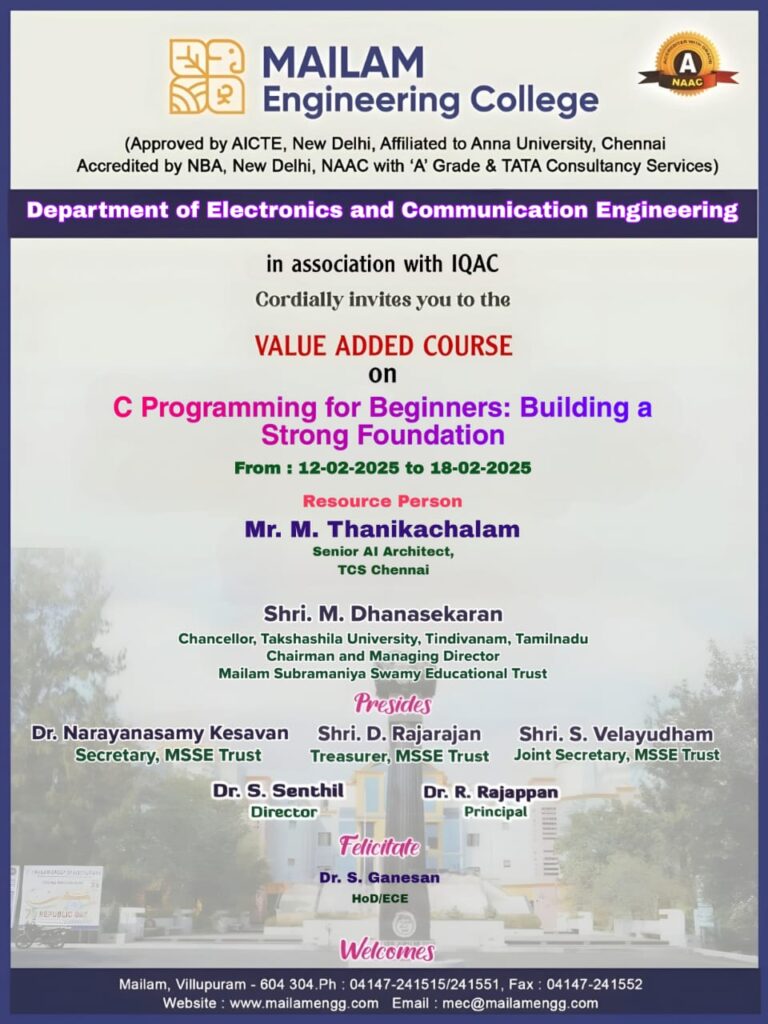 The Department of Electronics and Communication Engineering is organizing a Value Added course on ‘C Programming for Beginners:Building a strong Foundation’ from 12.2.2025 to 18.2.2025.