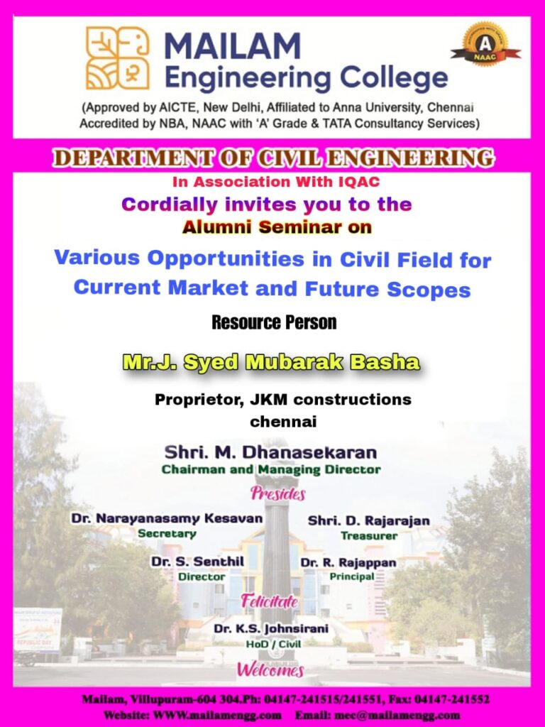 The Department of Civil Engineering is organizing a Alumni Seminar on Various Opportunities in Civil Field for Current Market and Future Scopes on 14.11.2024.