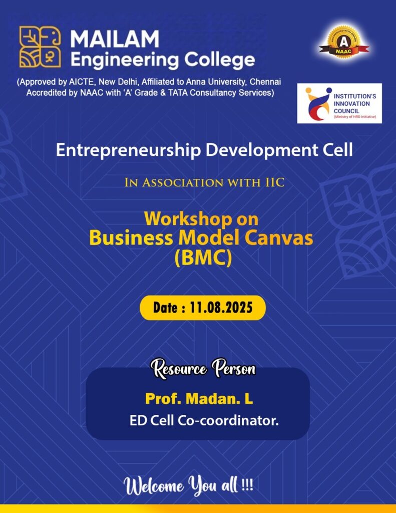 The Entrepreneurship Development Cell of Mailam Engineering College, in association with the Institution’s Innovation Council (IIC), is organizing a Workshop on Business Model Canvas (BMC) for UG and PG students on 11th August 2025. The session will be conducted by Prof. Madan L, ED Cell Co-coordinator, to guide students in understanding and applying the BMC framework for innovative business planning and entrepreneurship development.