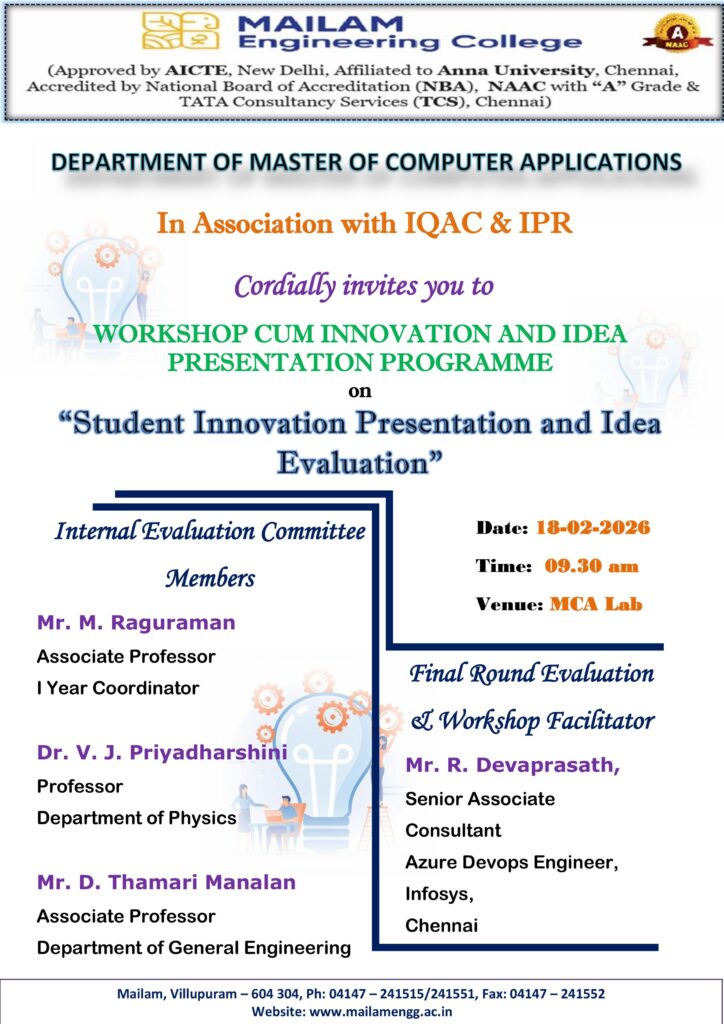 The Department of Master of Computer Applications is pleased to organize a workshop on “Student Innovation Presentation and Idea Evaluation” for MCA students on 18th February 2026. This workshop aims to provide students with a platform to present their innovative ideas and receive valuable feedback from experts in the field. Students will have the opportunity to showcase their creative concepts, gain insights on how to refine their ideas, and enhance their problem-solving skills. Join us for an interactive session that fosters creativity and innovation!